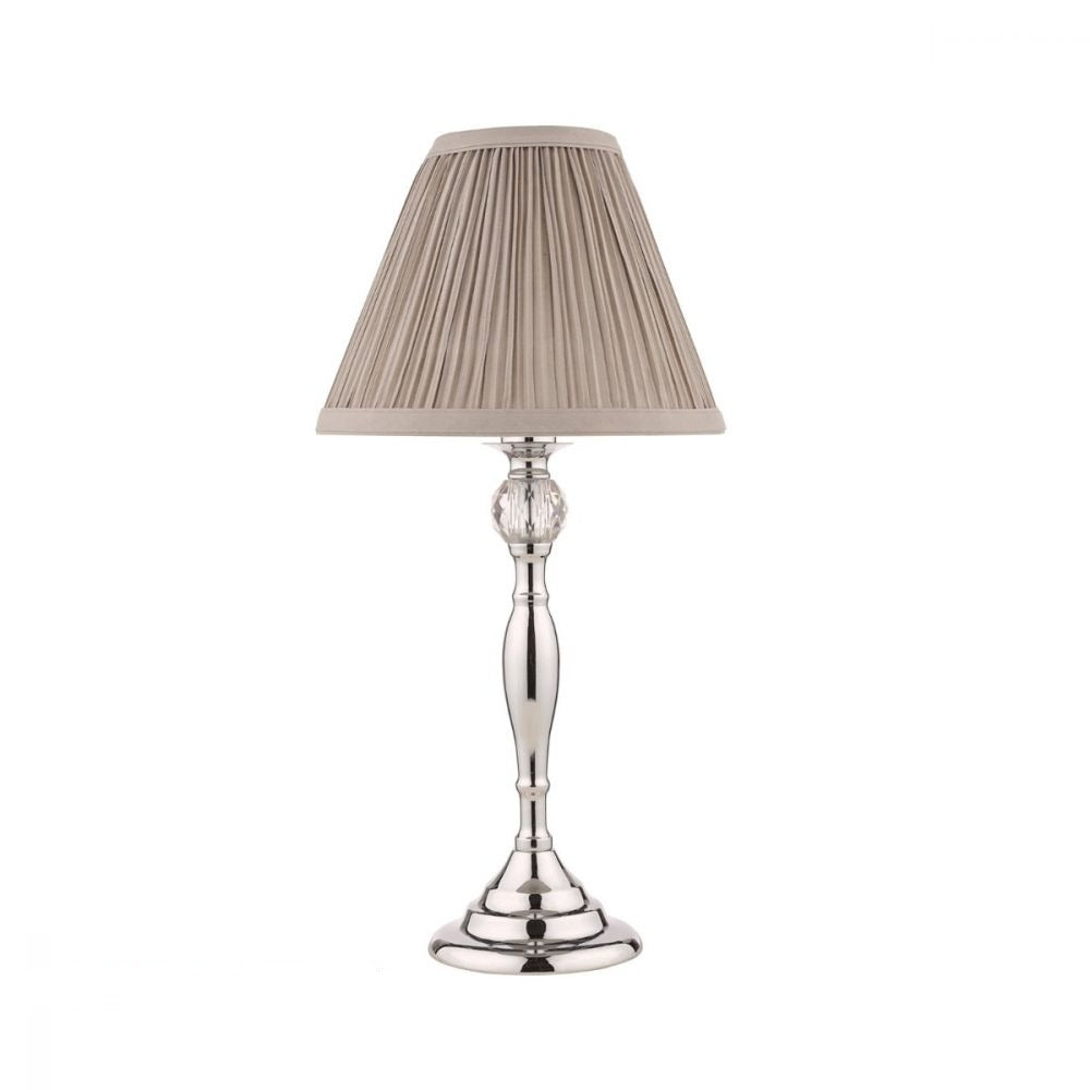 Made and designed for Laura Ashley Designed with an elegant chrome metal base incorporating a pretty faceted glass ball, this lamp comes complete with a light grey pleated fabric shade.