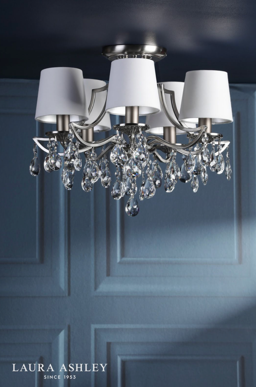 Elevate your living spaces with the understated elegance of the Laura Ashley 5 Light Semi Flush Ceiling Light. Its classic ivory fabric shades and lustrous polished nickel finish radiate a warm, cosy ambience that complements both modern and traditional interiors. The sparkling cut crystal accents add a subtle touch of glamour, making this ceiling light perfect for living rooms or bedrooms with lower ceilings.