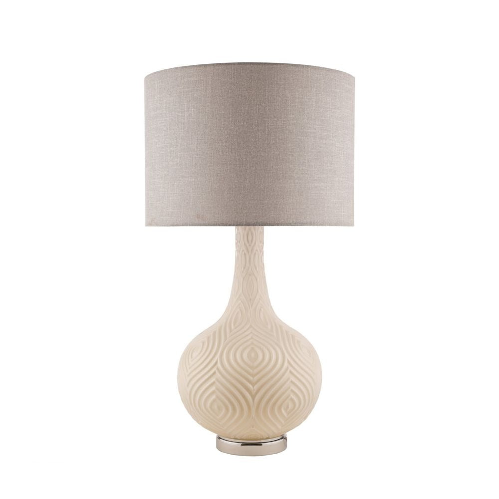 Grace from Laura Ashley has the look of opal glass (also known as milk glass), as the raised, ogee-patterned surface has been painted white. This lovely table light is accompanied by a grey linen cylinder shade and finished with bright polished nickel metalwork, including the round ring the base sits on.