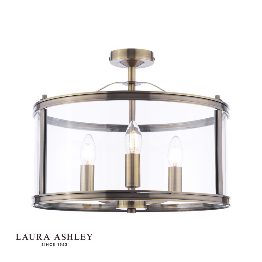 The Laura Ashley Harrington Semi Flush Lantern Light is a graceful blend of clear glass and sleek metal. This simple, lantern-style light has sophisticated Antique Brass finish creating an elegant look. The three-light Harrington ceiling Semi Flush is a subtle yet stylish piece to illuminate your favourite room and create a bright, inviting space. We recommend the use of LED bulbs as they are more energy efficient, typically last at least 15000 hours and use 90% less energy than a traditional halogen bulb. Less energy means lower electricity costs.