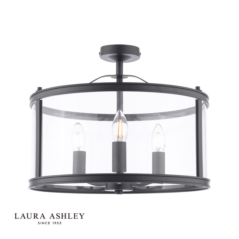 The clean-lined Laura Ashley Harrington semi flush light is a graceful blend of clear glass and sleek metal. A simple, lantern-style drum-shaped case surrounds a suspended trio of lamp-holders, all in a sophisticated black finish for effortlessly elegant looks. The three-light Harrington semi flush light is a subtle yet stylish piece to illuminate your favourite room and create a bright, inviting space.