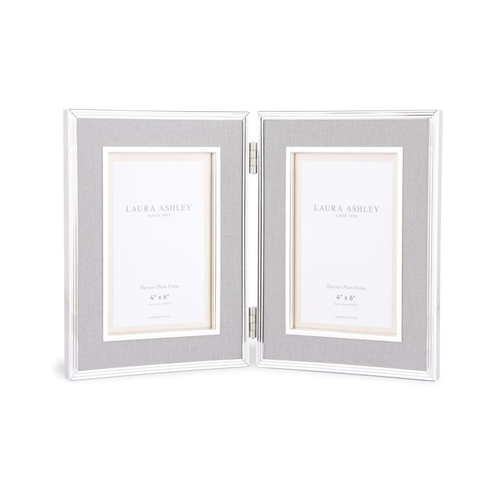 With a silver-plated metal frame faced in pale charcoal linen fabric and with raised beading, the elegant hinged double Harrison photograph frame from Laura Ashley is perfect for displaying your most treasured images. The understated opulence of this silver and grey photo frame will enhance any interior. Holds two 10x15cm approx. (4"" x 6"") photos. Folding photo frames are free-standing, designed for table display only. Please note, the size refers to the size of the photo within the frame, which usually allows for an overlap of approximately 5mm.