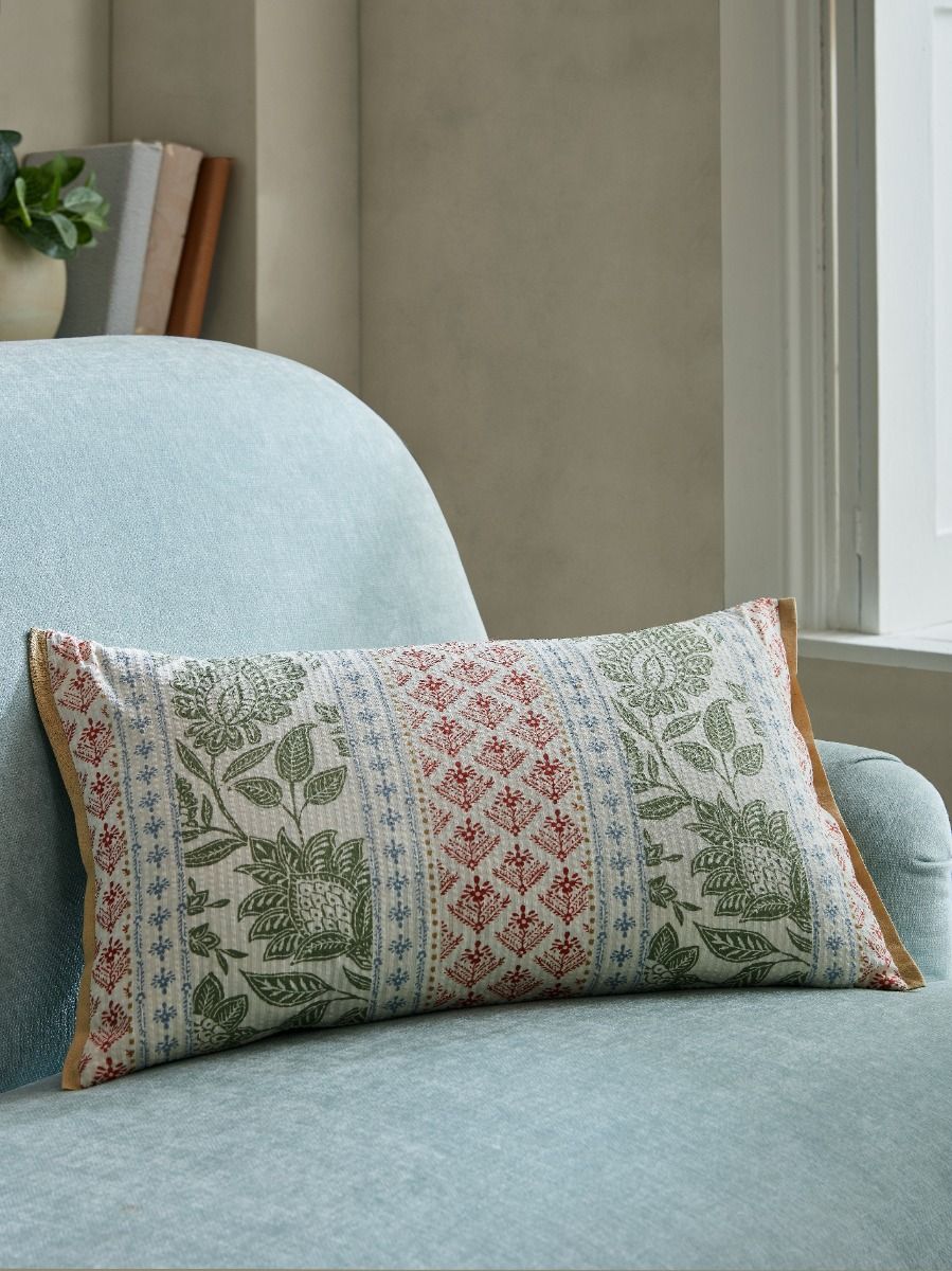A mix of colour and pattern. This reversible printed cushion in cotton has a bold green edge to frame the stripes of colourful print. Bringing an ethnic twist for a modern classic interior. Mix and match with the other cushions in this story to create impact. Cushions are filled with a luxury fine denier, recycled fibre “Feels like Feather” pad.