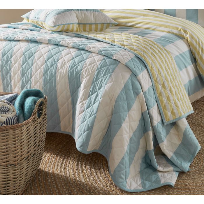 Lille stripe is a broad stripe design in two tonal colours to create a sophisticated but subtle effect, a seaspray blue face contrasts with a soft ochre reverse on this beautiful, quilted throw. Printed on to a soft cotton with smart seaspray blue edge detail. Composition 100% Cotton