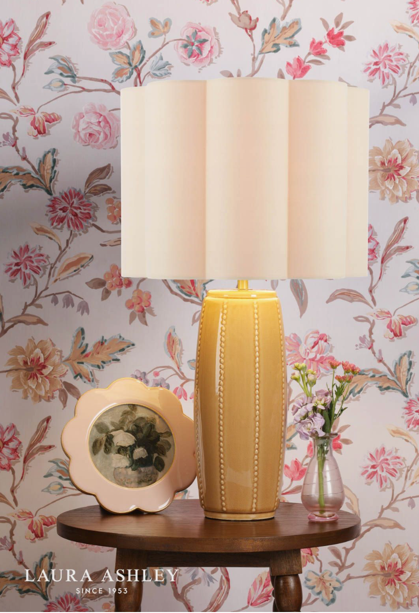 Bring a splash of sunshine to any room with this charming Laura Ashley table lamp in rich ochre. The distinctive crackle glaze finish catches the light beautifully, while the natural scalloped shade adds a graceful touch that feels both classic and fresh. This versatile table lamp works perfectly whether you're dressing up a bedside table or adding warmth to a console display. Laura Ashley's signature blend of traditional craftsmanship and contemporary style shines through in every detail, from the harmonious proportions to the carefully chosen materials. The faux silk shade diffuses light elegantly, creating a cosy glow that transforms any corner into an inviting space.