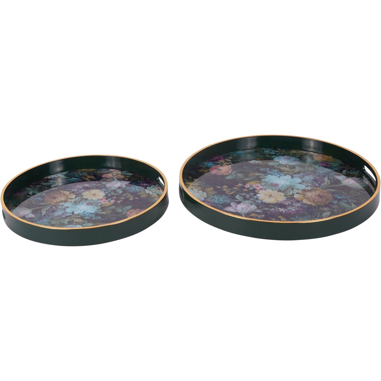 Set of two nesting trays featuring famous Laura Ashley floral design set against a rich green background with gold detailing on the tray edges. Part of a collection of tables, placemats, trays and coasters featuring the same design. Large 45W X 45D X 4H, Small 36W X 36D X 4H cm.