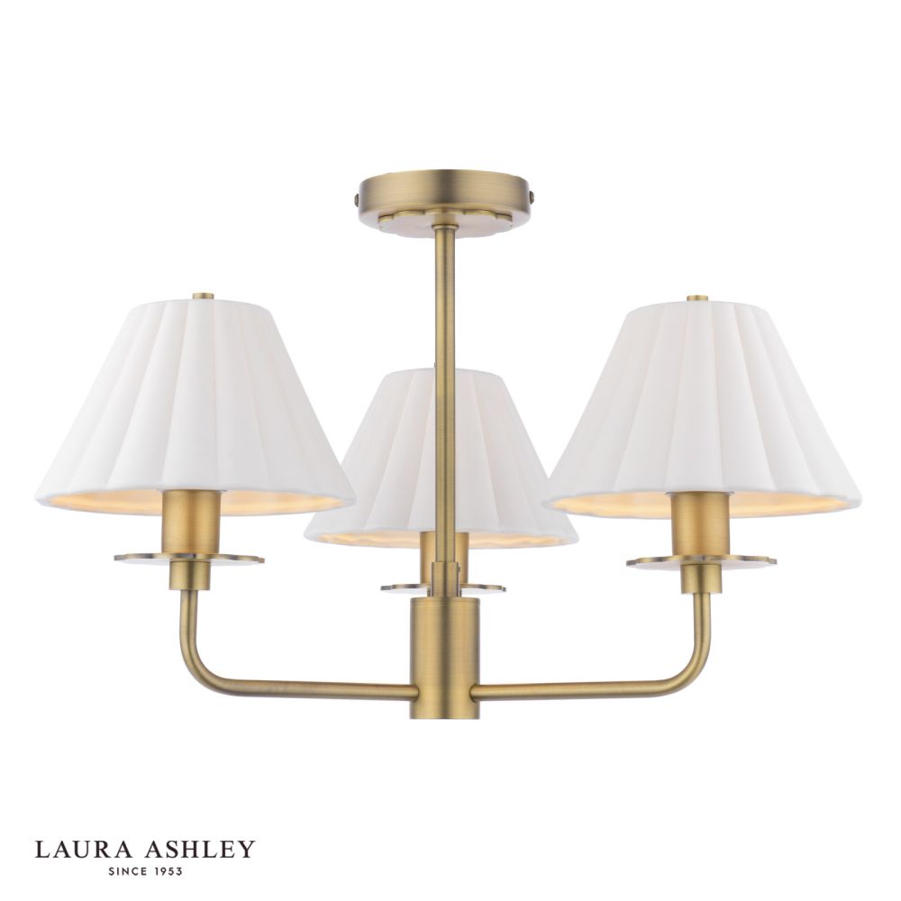 Add a touch of sophistication to your living space with the Laura Ashley 3 Light Semi Flush Ceiling Light. Its warm antique brass finish and charming scalloped porcelain shades cast a flattering, ambient glow perfect for the bedroom or living room. With its stylish blend of heritage and modern flair, this ceiling light is a timeless piece.