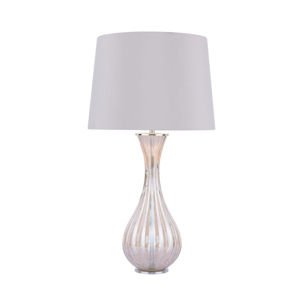 The ribbed glass has been electroplated with the champagne finish the ribbed glass catches the light very well and the faux grey silk shade that comes with it has a gold lining adding to the overall statement that this lamp will create.