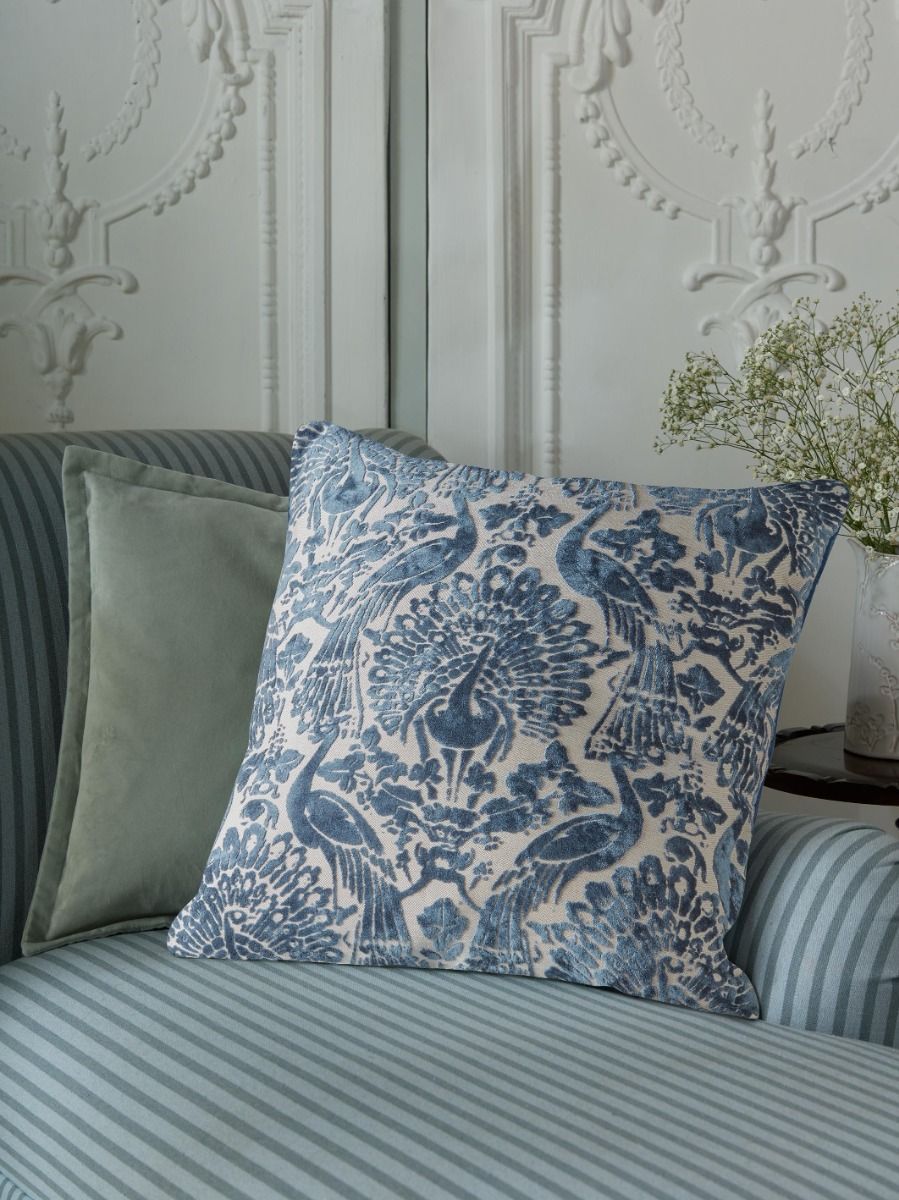A beautiful cut velvet cushion, made from sumptuously soft dusky blue velvet on a natural base. Elaborate peacocks with elegant plumes of feathers adorn this stunning cushion in a damask style design. A luxurious velvet reverse finishes this cushion perfectly, and is filled with a luxury fine denier, recycled fibre “Feels like Feather” pad.