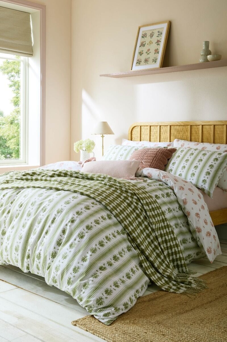 Accessories shown in photography: Scalloped Old Rose Cushion, Flaxley Stripe Pink Cushion, Knapton Olive Green Throw