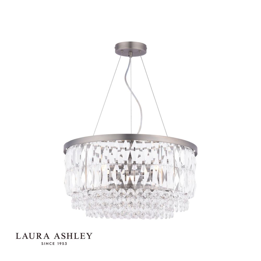 The Rhosill Chandelier by Laura Ashley features stunning facetted glass crystals with a gorgeous pewter metal accents. This statement ceiling light would complement any room.
