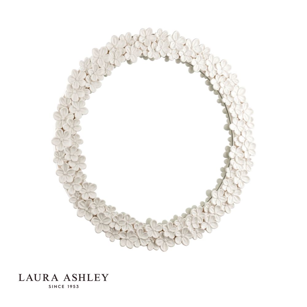 Add a touch of timeless British charm to your space with this exquisite Laura Ashley mirror. The round silhouette features delicate floral details crafted in white resin, creating an elegant frame that catches the eye without overwhelming your decor. This Laura Ashley mirror doubles as both a practical necessity and a sophisticated piece of wall art, perfectly balancing form and function. The pristine white finish works beautifully in any room, from brightening up your entryway to adding a decorative focal point above your mantel. Whether you're doing a final outfit check or wanting to make your room feel more spacious, this mirror brings classic style to your everyday moments