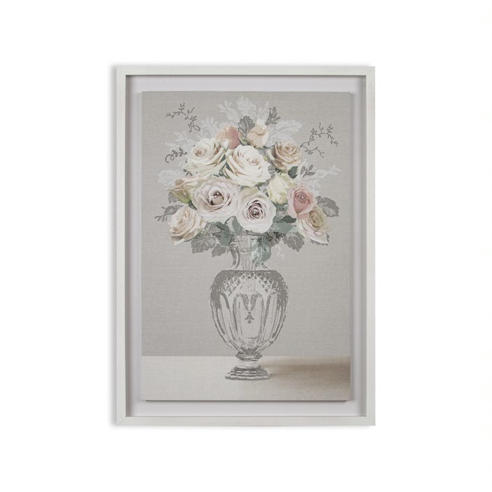 The Rose Bouquet vase in blush is a timeless design of aromatic rose bouquet embellished with beautiful pearls. The classic canvas design floats within a wooden frame.
