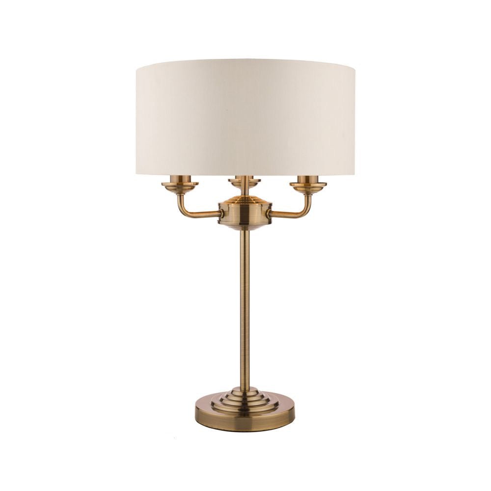 Classic Subtle and sophisticated, the attractive Sorrento table light from Laura Ashley boasts three lights on arms, all encased in a single contemporary drum shade in sleek ivory silk-effect fabric with a pearlised inner. A straight stem rises up from a round, Art Deco style, stepped base. This triple light table lamp comes in a traditional warm antique brass finish, adding grown-up atmosphere to your dining or living area.