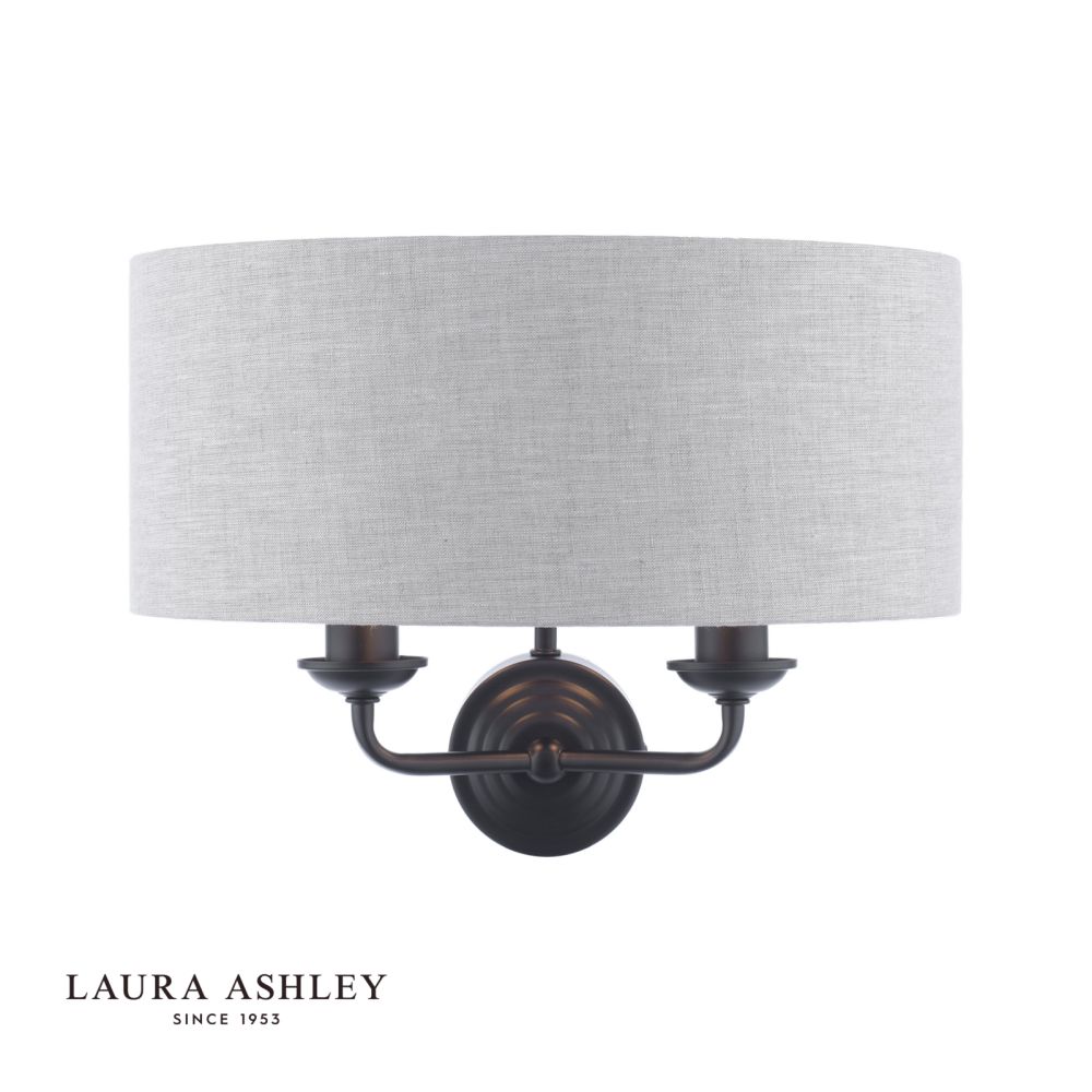 This chic Laura Ashley Sorrento Wall Light features two lights encased in a single contemporary drum shade in a natural slubbed linen with a metallic silver inner. The two light wall light comes in a painted black finish, adding a sophisticated atmosphere to your dining or living area.