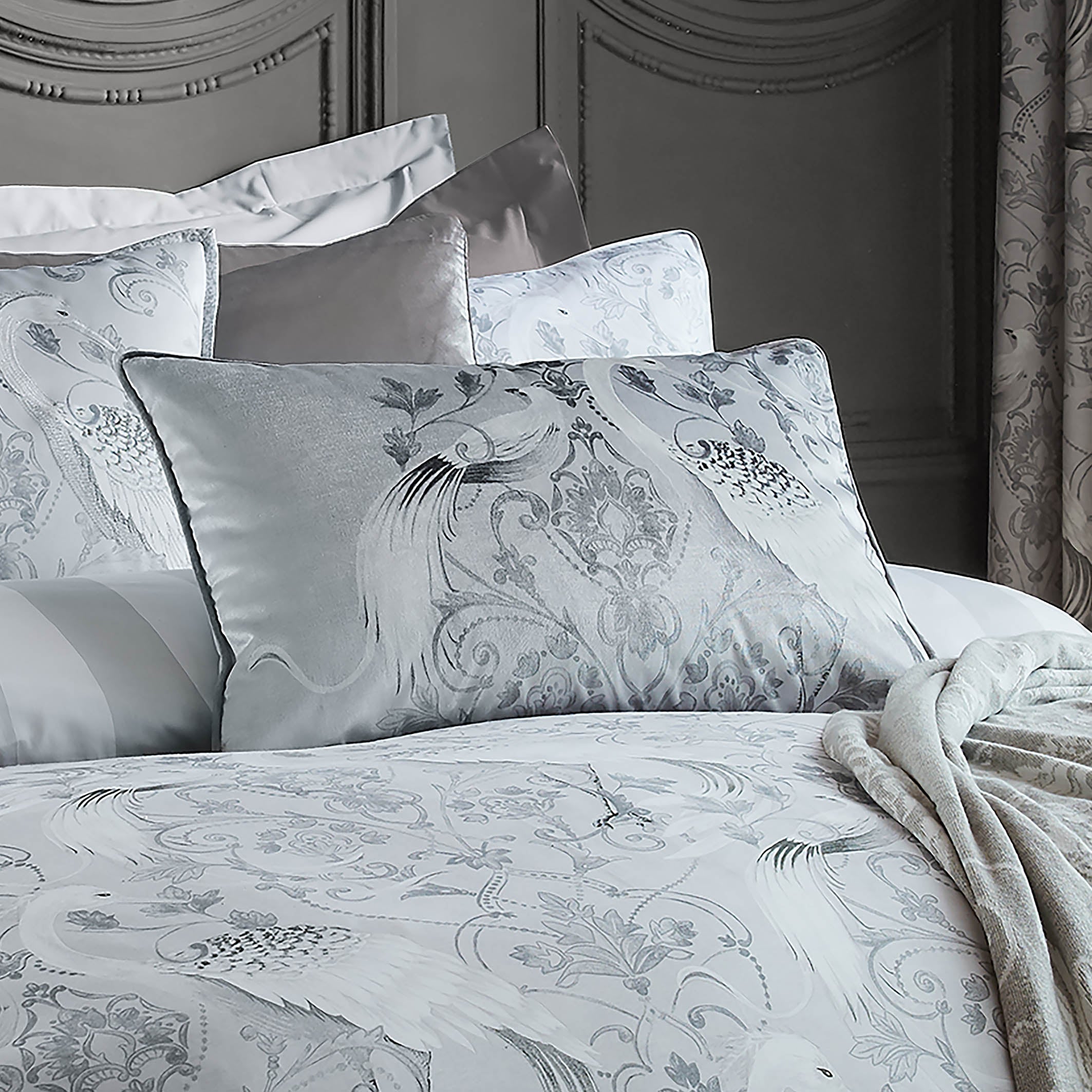 Add a touch of glamour to your home with Lara Ashley’s new Tregaron design. Hand painted birds entwined in delicate damasks are printed onto luxurious velvet. This cushion is finished with a velvet piping and reverse and comes with a feather filled pad.