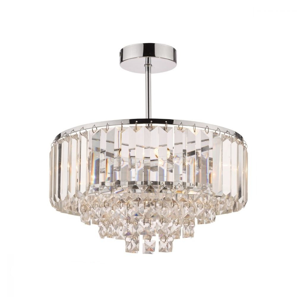 A lovely light designed for Laura Ashley its finished in a polished chrome and is flush fitting so ideal for a low ceiling area, the fitting has 3 bulbs and it has a cascade of crystal from the centre with long crystal drops around the edge.