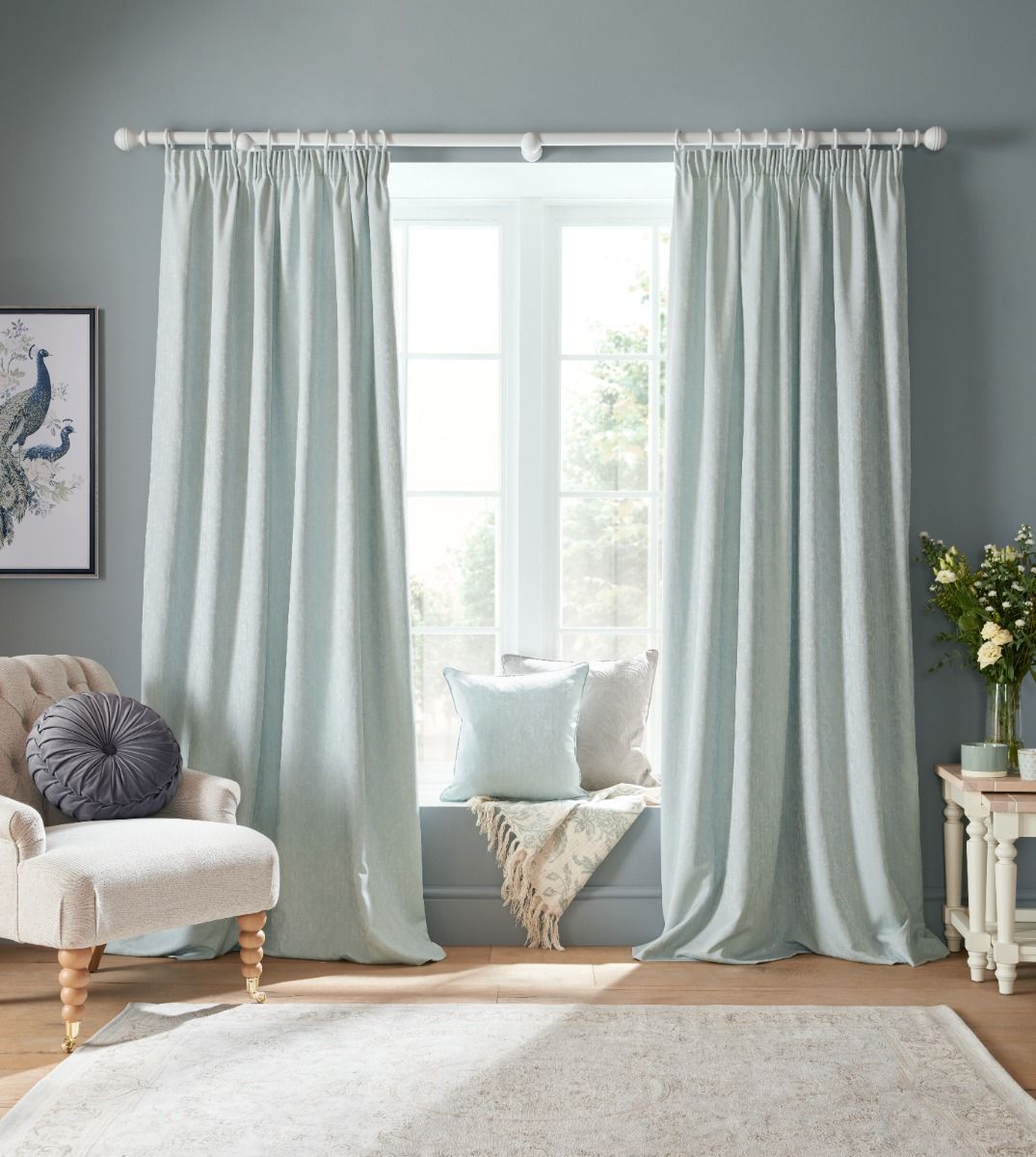 A beautiful, contemporary jacquard curtain with timeless woven texture. A luxurious sheen adds a touch of elegance. In a sophisticated Duck egg palette with a smart pencil pleat header