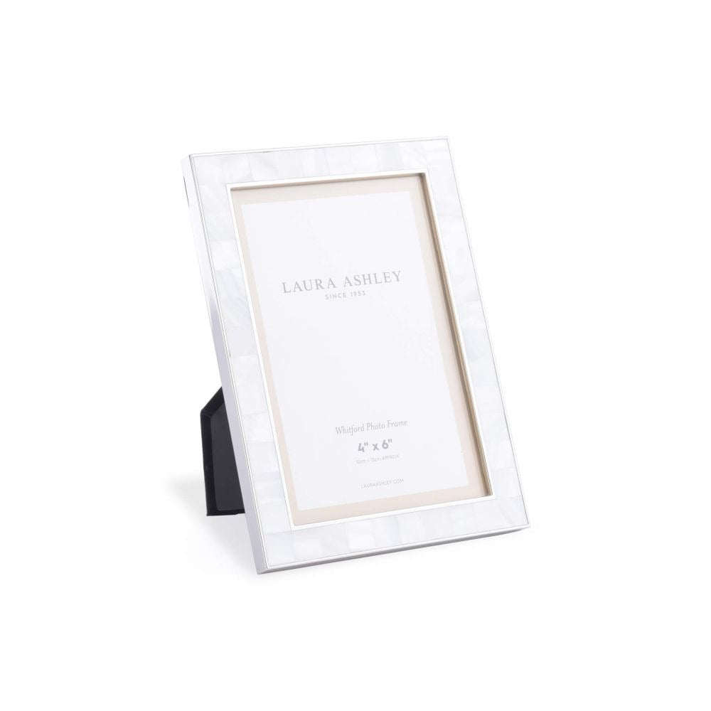 A broad border of iridescent shell is perfectly juxtaposed with the nickel-finish frame in the Whitford photograph frame from Laura Ashley. Subtle, serious, special. Holds one photo. Free standing, for both portrait or landscape orientation. Nickel-plated metal frame, glass fronted, with a black velvet backing.