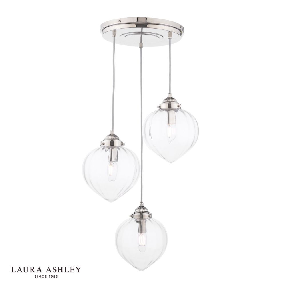 Elevate your lighting with the classic and timeless Laura Ashley Whitham 3 Light Cluster Pendant. This eye-catching ceiling light features three polished nickel lamp holders suspending ribbed glass shades that cast a soft, ambient glow. The warm metallic finish beautifully complements Laura Ashley's signature floral prints, while the adjustable height allows you to customise the pendant to suit your ceiling. Part of a cohesive range, this piece can be effortlessly coordinated with other items from the Whitham Lighting Collection. W