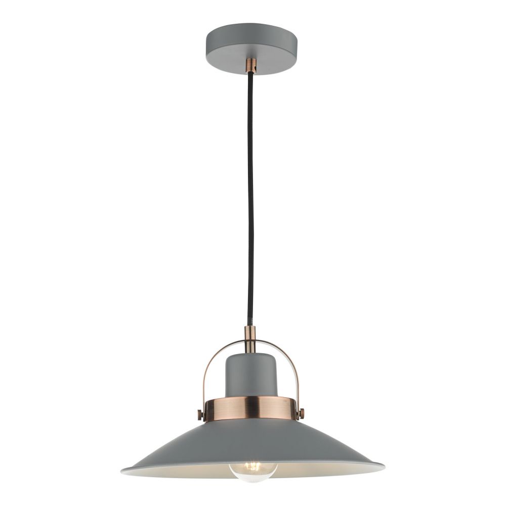 The Liden single pendant features an angular matt grey painted metal shade with copper detailing and matching ceiling plate, offering a more contemporary industrial look.