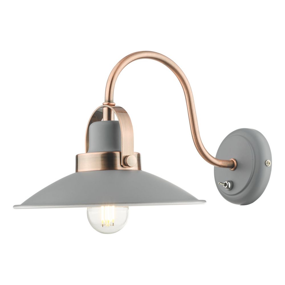 The Liden single wall light features an angular matt grey painted metal shade with copper detailing on a swan neck arm with matching wall plate and toggle switch, offering a more contemporary industrial look.