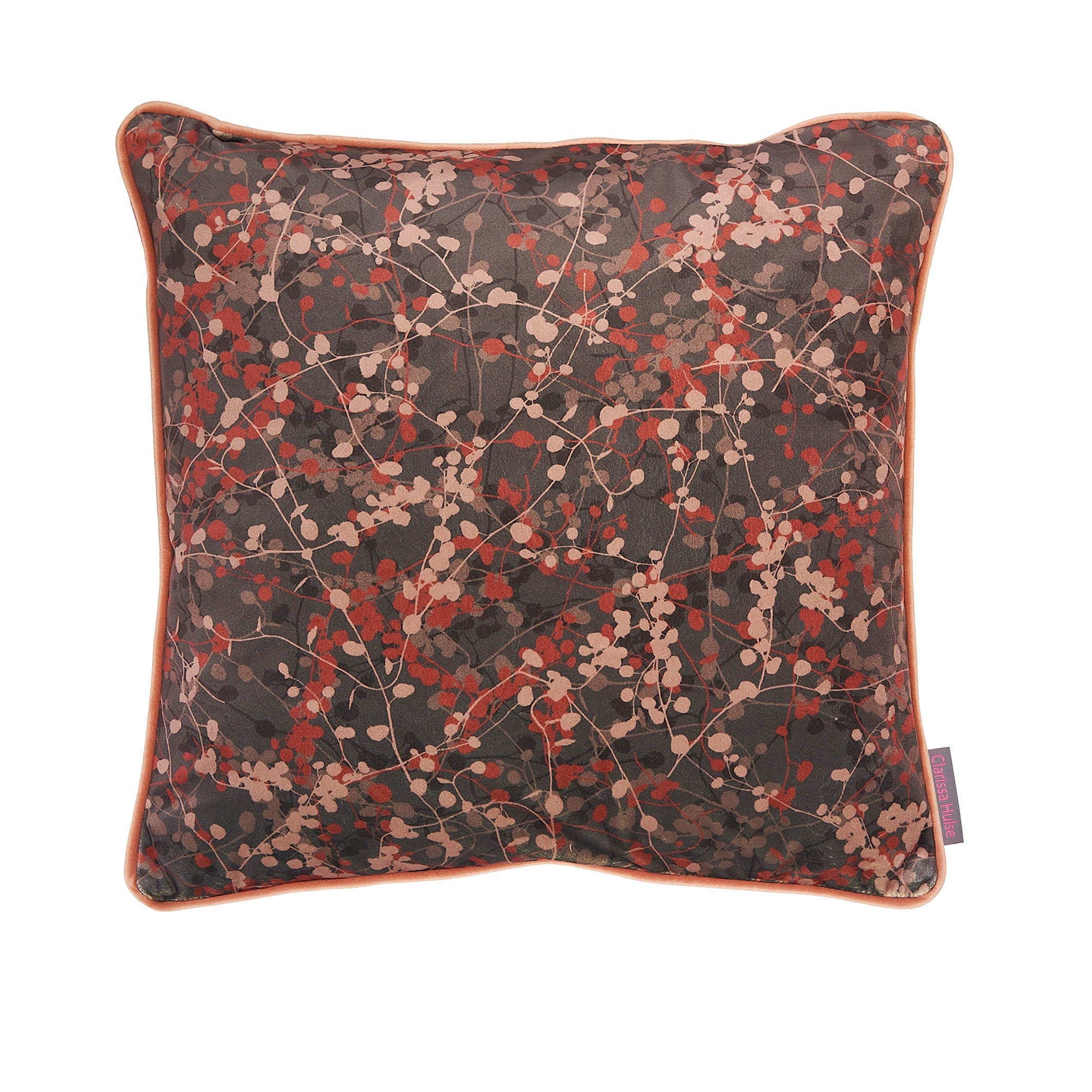 This playful botanical velvet cushion is composed of layers upon layers of ditsy vines. Mocha, shell, stone, and terracotta dots glimmer against a burnt umber ground, creating an abstract painterly composition that can be endlessly enjoyed on any sofa, chair, or bed.