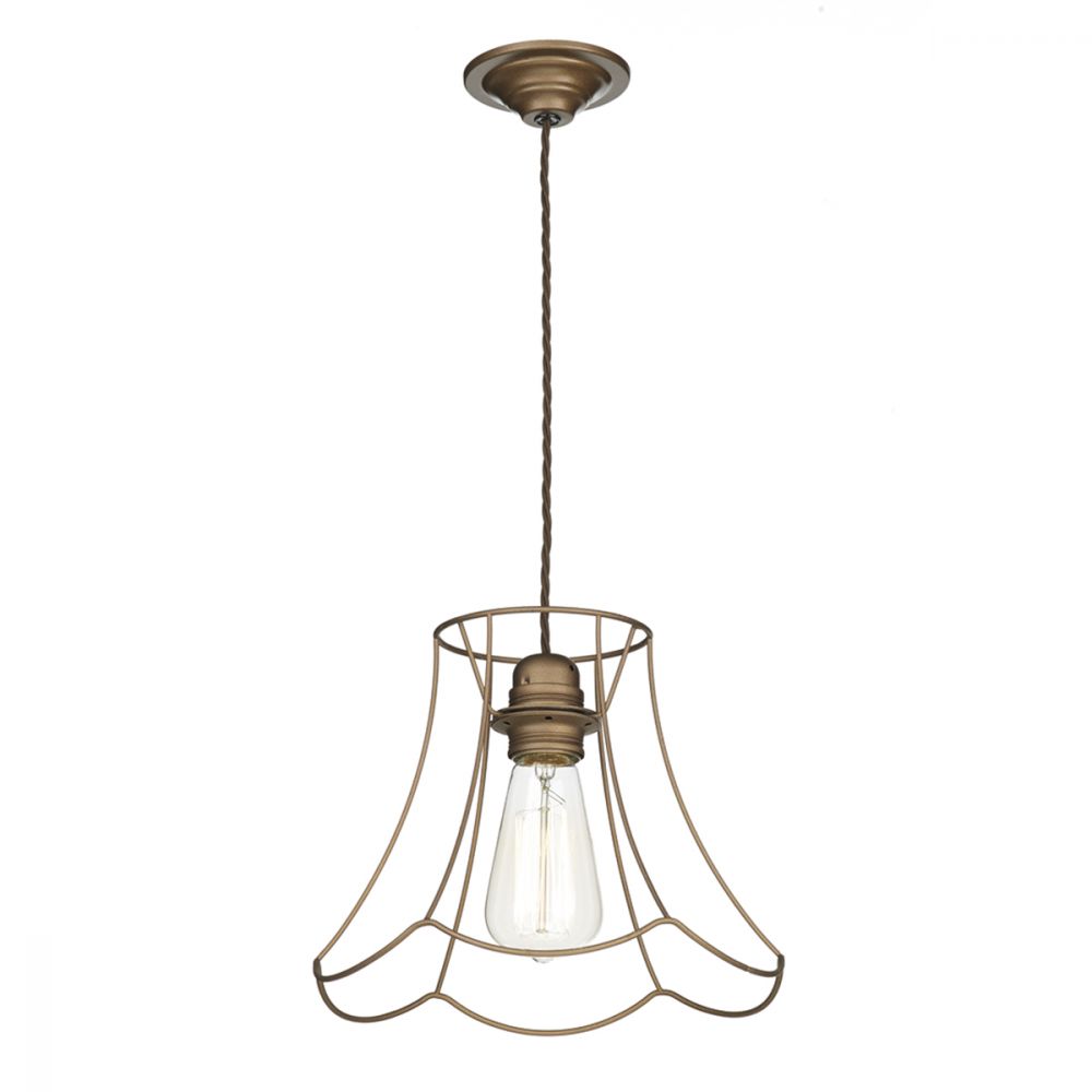 Oregon single light pendant with bronze traditional lamp shade cages, brown braided cable and bronze circular surface mounted ceiling plate.