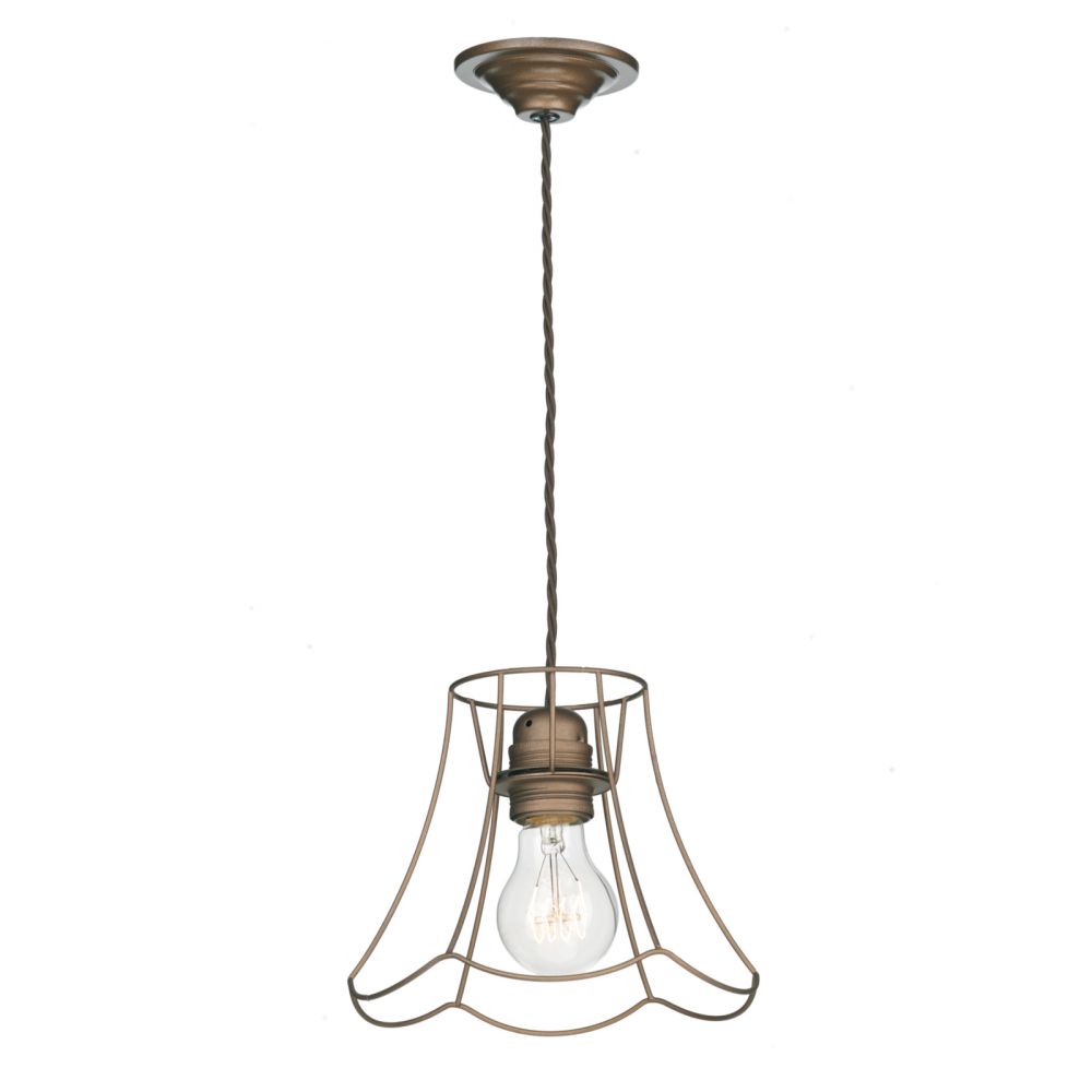 Oregon single light pendant with bronze traditional lamp shade cages, brown braided cable and bronze circular surface...