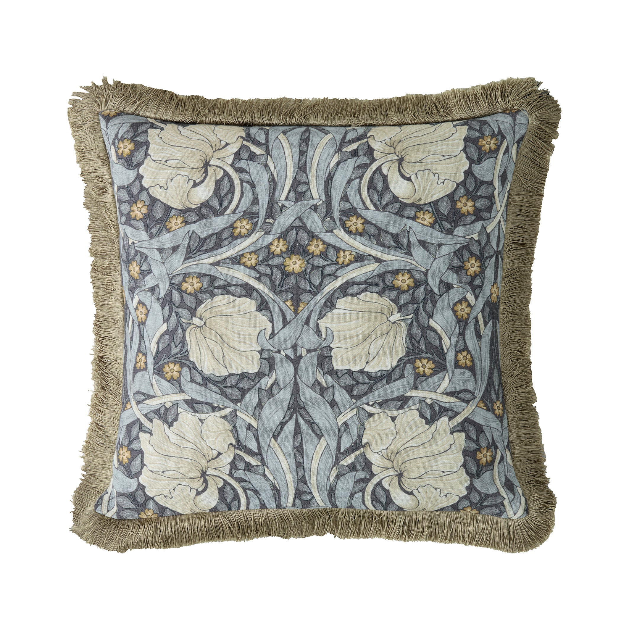 The Pimpernel design features large sensual tulips and their curling leaves, intwined with foliage and small pimpernel flowers, the pattern layout is almost symmetrical and was originally hung at Kelmscott Manor, the summer home of William Morris in West Oxfordshire. Digitally printed onto an elegant linen-look, cotton base in a classic color palette of blues, creams and yellow, with a cream cotton-velvet reverse and smart fringed edging; this cushion is perfect for celebrating pattern and nature in your home.