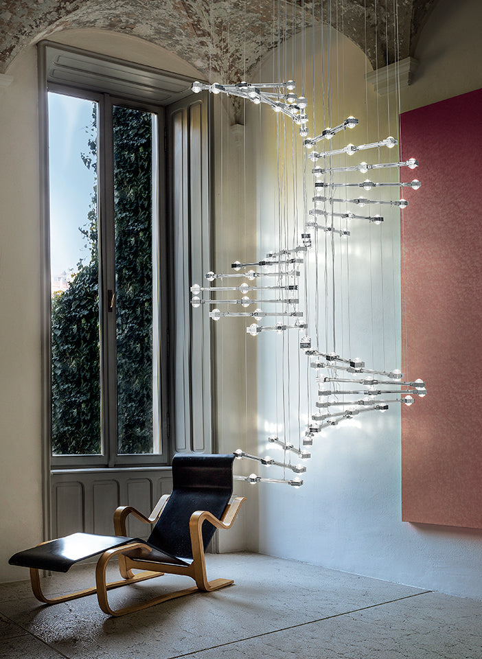 A stunning design by Marc Sadler for Masiero, part of a collection the Raqam family can be made to many bespoke sizes and dimensions depending on your project. The metal frame as shown in chrome is covered with glass, crystal pendants. There are several metal options available, Chrome as shown, Gold, Red, White, Green, Brown, Burnished all with co ordinating crystal pedants. This fitting would work perfectly in a stairwell or high ceiling area to allow for the drop as a feature, the fitting is very airy yet dramatic with the flow of the framework. Please contact us if you require further information.