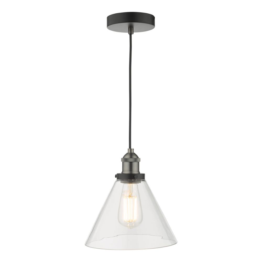 The Ray single light pendant offers up the industrial style, combining antique nickel metalwork with matt black detail and a conical clear glass shade that can showcase decorative light bulbs; the Ray looks great when teamed with a vintage bulb as pictured.