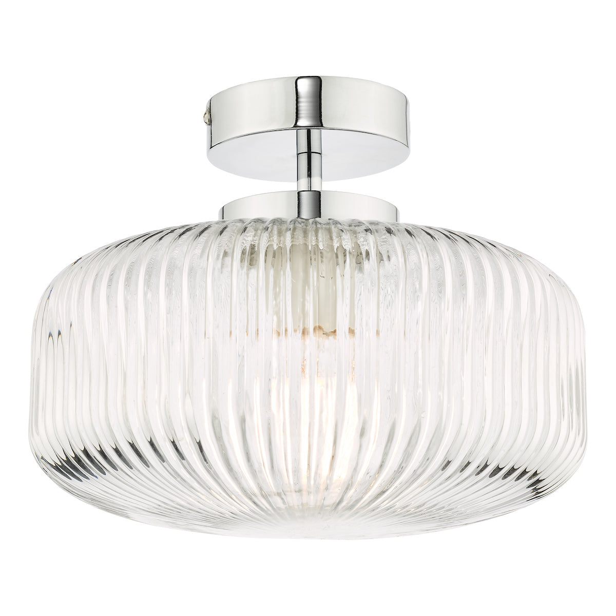 The Riva bathroom ceiling light consists of a brilliant ribbed glass shade and polished chrome metal work. The light gives a radiant effect through the glass and looks great during the daytime.