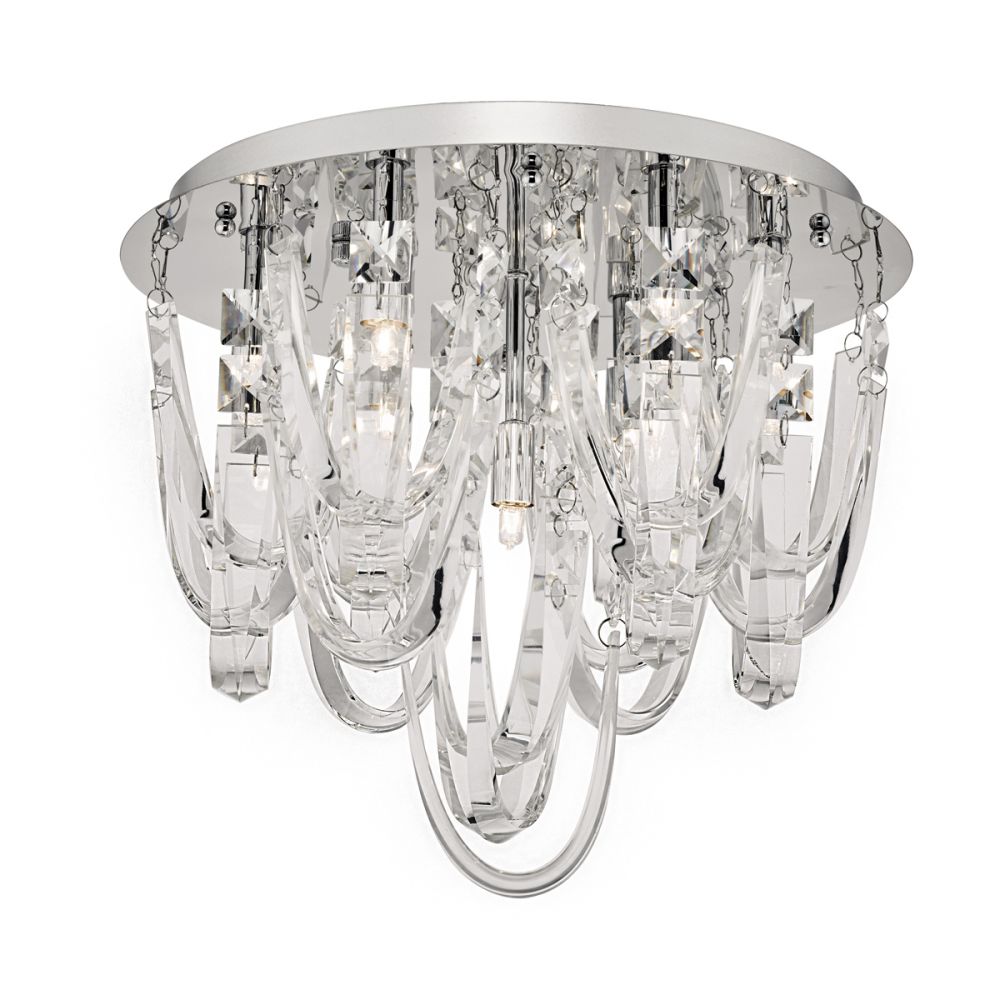 The polished chrome ceiling plate reflects all the light back into the room on this fitting, which is dressed with a swag effect of glass and square crystal droppers, the G9 bulbs can be bright as there are 7 of them a LED bulb could be used to make it low energy if required.