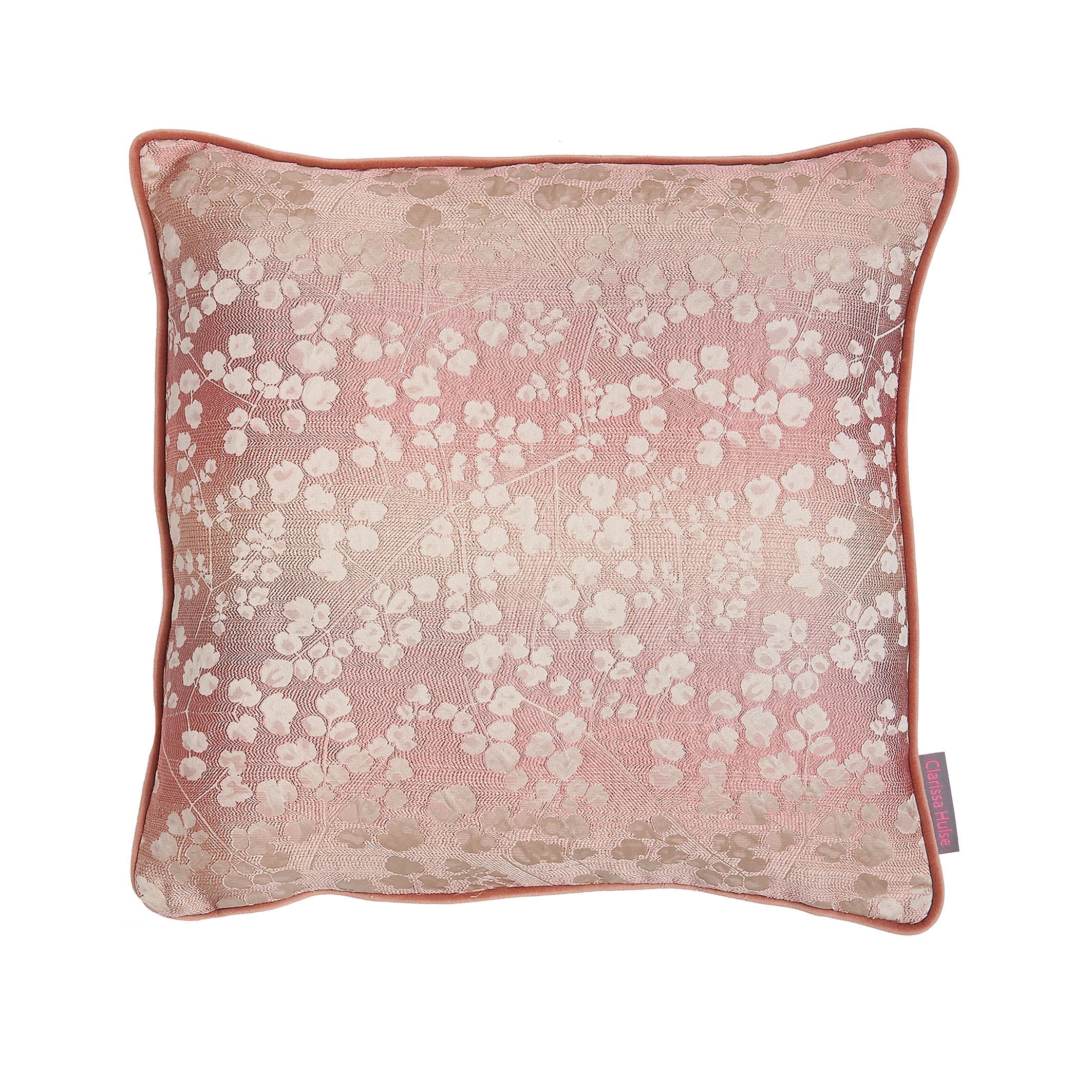 The slender stems and cloud-like leaves of this thalictrum seem to float across this luxuriant jacquard piped cushion. Each leaf catches the light against the shell pink ombre ground. Also known as rue, this airy plant is usually found in wild, woodland settings.