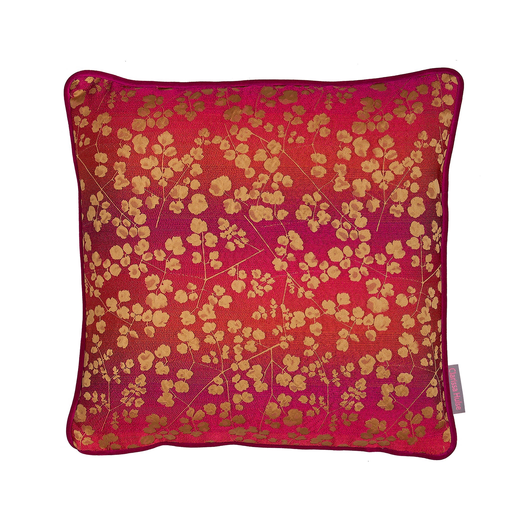The slender stems and cloud-like leaves of this thalictrum seem to float across this luxuriant jacquard piped cushion. Each leaf catches the light against the sunset ombre ground. Also known as rue, this airy plant is usually found in wild, woodland settings.