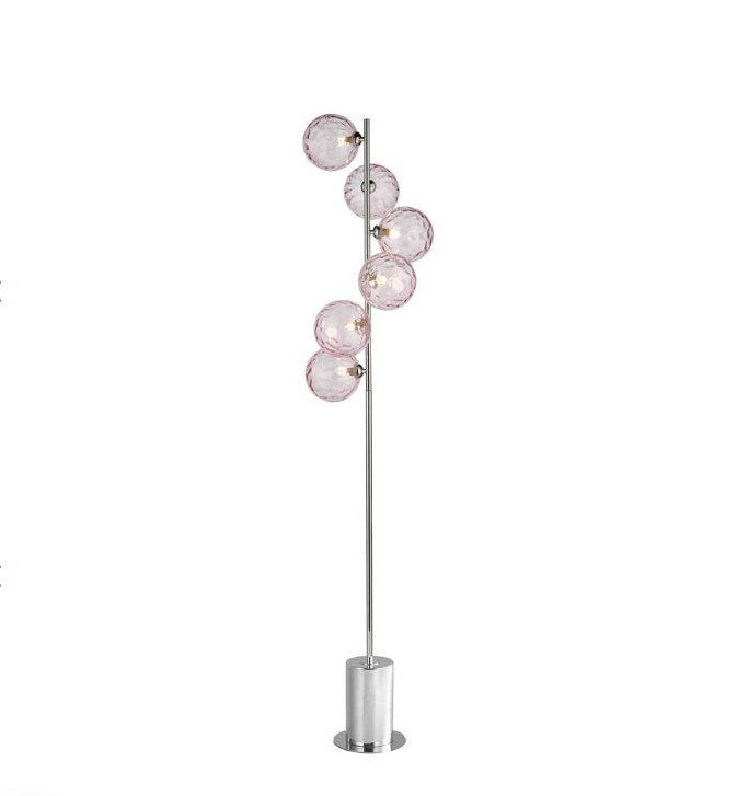 The Spiral 6 Light Floor Lamp features large pink glass globes spiralling around a vertical polished chrome bar with a dense, slender base and low profile plinth for a contemporary look.