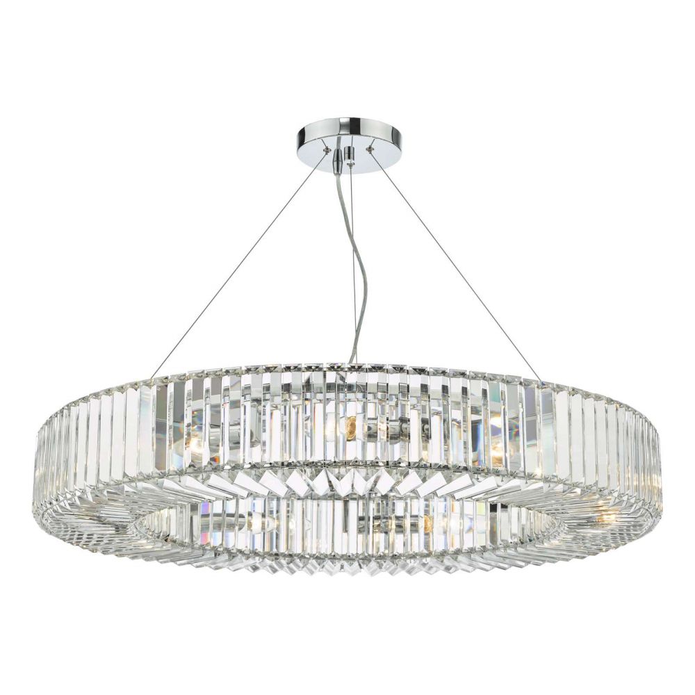 This circular chandelier comprises hundreds of pieces of beautiful bevel cut crystal. Its shallow height, combined with steel tension cables and reflective crystal coffins creates a sense of weightlessness. With a diameter of over 80cm and an adjustable height of between 50 and 200cm, this large chandelier is very versatile. The clear crystal reflects its surroundings effortlessly to create a stunning centre piece.