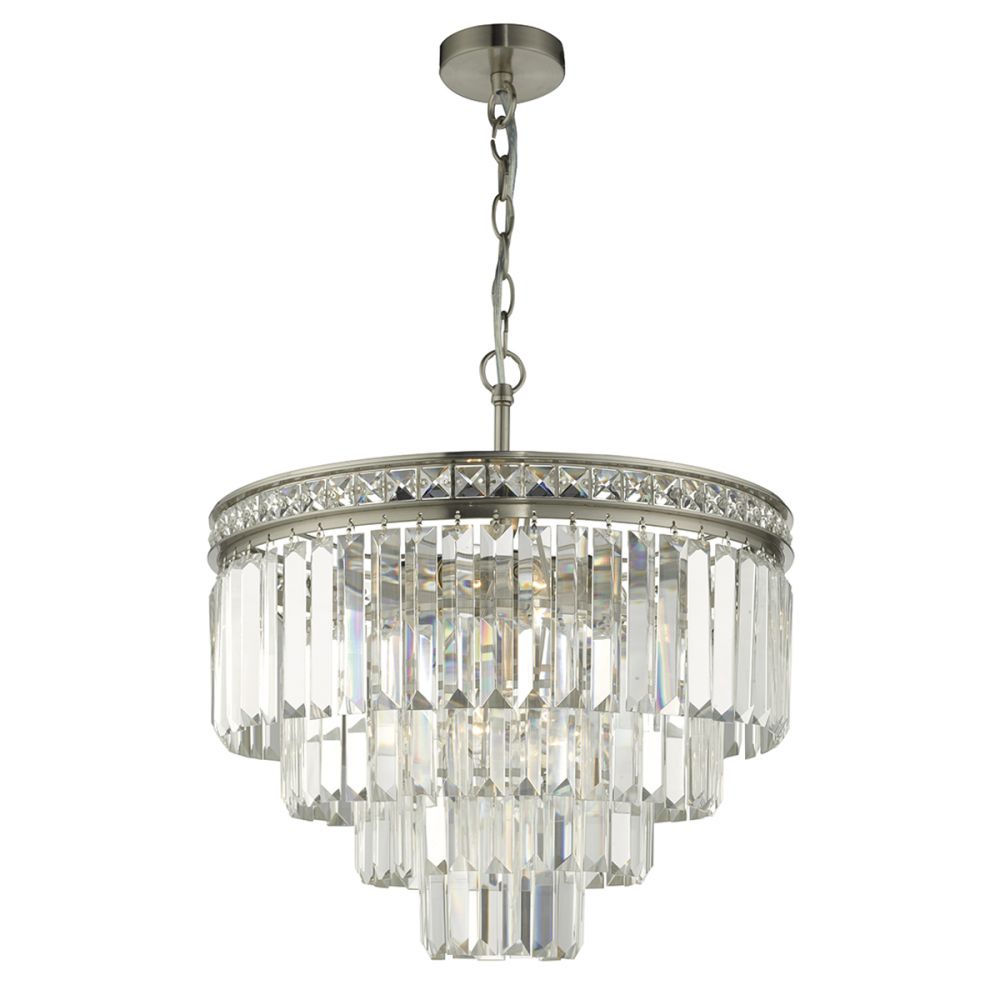 Available in three finishes. The Vyana is a classic crystal pendant in polished nickel with faceted crystal squares decorating the frame from which cascade 4 luxury layers of heavy cascading crystal droppers cut a prism shape. With its high fall, the Vyana statement ceiling light is ideal for use with high ceilings or over tables.