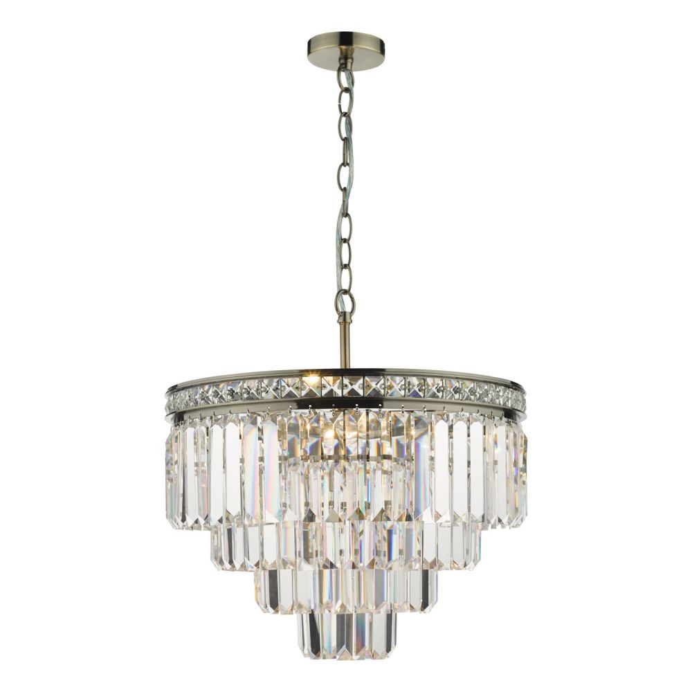 Available in three finishes. The Vyana is a classic crystal pendant in polished nickel with faceted crystal squares decorating the frame from which cascade 4 luxury layers of heavy cascading crystal droppers cut a prism shape. With its high fall, the Vyana statement ceiling light is ideal for use with high ceilings or over tables.