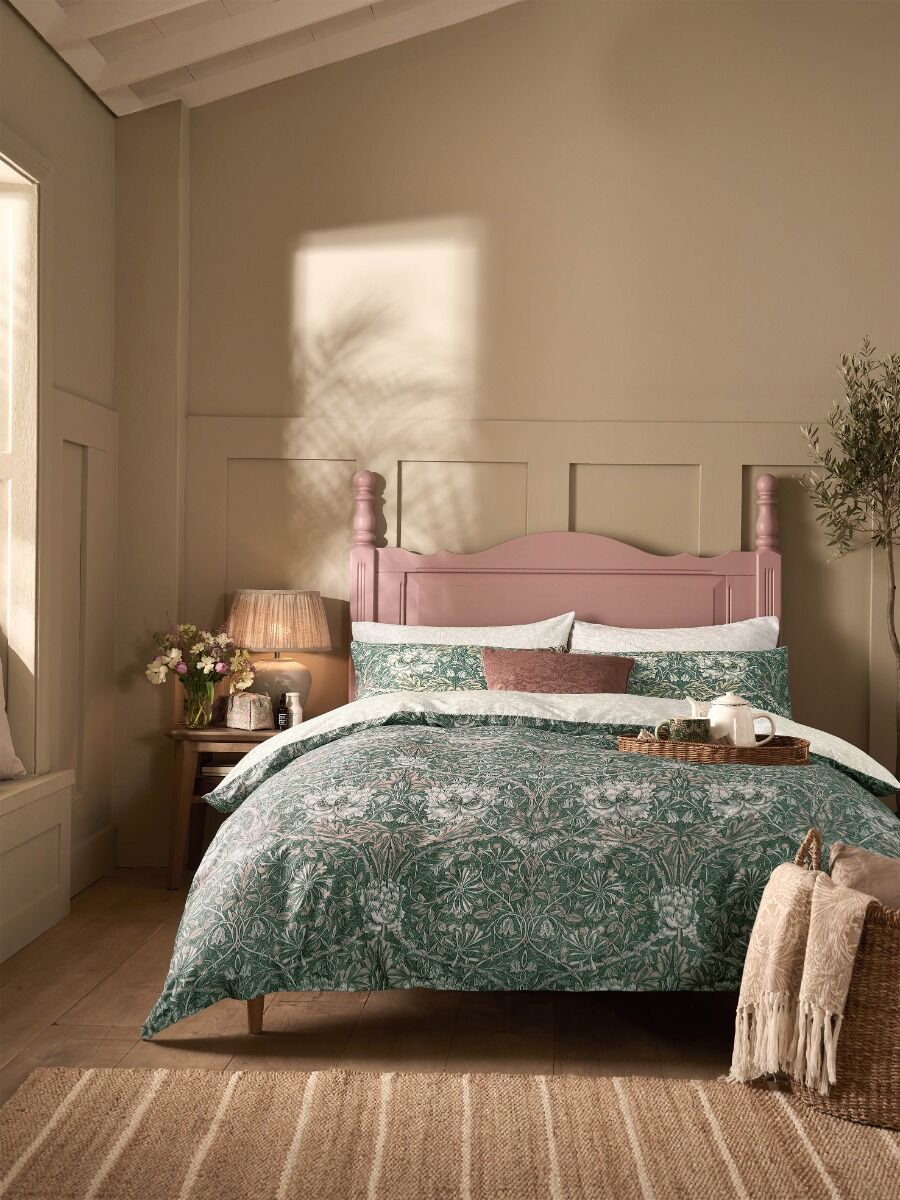 Designed by William Morris in 1876, Honeysuckle and Tulip was described by his daughter, May Morris as ‘the most truly “Morrisian” in character of all his-pattern making in later life’. This intricate design showcases four of Morris’s favourite flowers to include crown imperial, tulip, honeysuckle, and fritillary, set against a dense yew background. Printed onto a beautiful 220 thread count cotton sateen base, this reversible bedding is coloured in a sophisticated palette of soft sage greens and plaster pink tones. This design, known for its harmonious balance, captures the essence of William Morris's later work, combining nature-inspired motifs with a refined sense of structure.