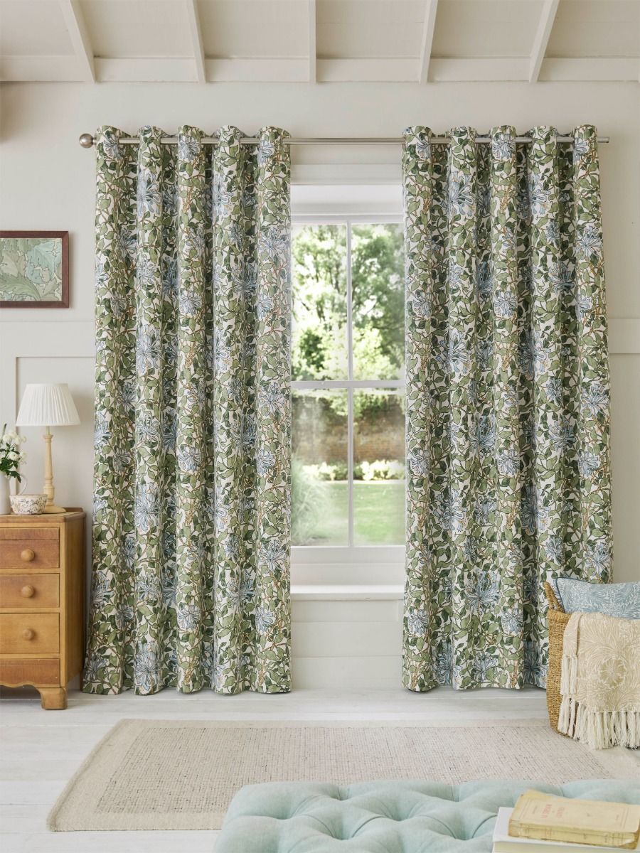 Created by William Morris’ daughter, May, in 1883, Honeysuckle is a light and uplifting design based on a net structure of untamed woody stems, small curling leaves and honeysuckle flowers. One of three wallpapers attributed to May, Honeysuckle was her most popular finished pattern. Coloured in soft sage green and powder blue shades, this beautiful 100% cotton eyelet curtain has a blackout lining and is perfect for bringing nature’s beauty into your home.