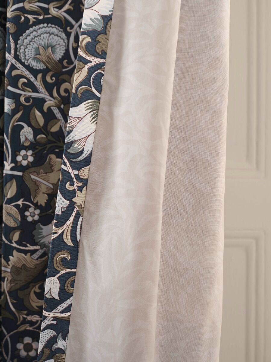 William Morris had a great admiration for rivers, from the humble stream that passed by Kelmscott Manor to the great River Wandle that he used to dye his textiles at Merton Abbey. From 1883 Morris began designing a series of gently flowing patterns named after tributaries of the River Thames. The Lodden pattern is part of this series, named after the River Loddon, that flows through Berkshire and Hampshire. In rich deep blue and olive-green tones, the Lodden eyelet curtains are printed onto a beautiful 100% cotton Panama base and finished with a beautiful, printed lining, featuring Morris’ iconic Willow Bough design.