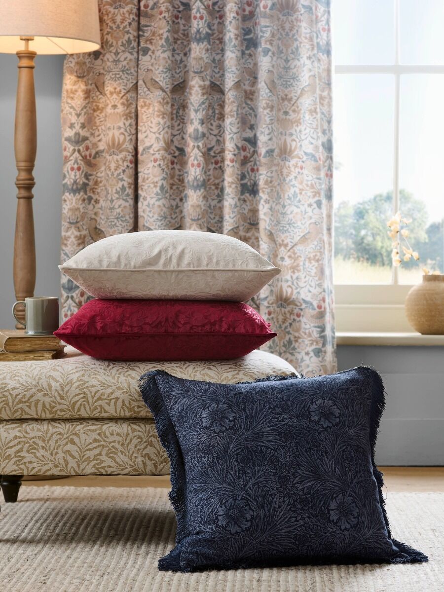 Marigold was designed by William Morris and registered as wallpaper in 1875. The pattern incorporates larger marigold flowers amongst sprays of willow like leaves, against a backdrop of smaller foliage and flowers. Colored in a rich, indigo blue palette and printed onto a linen-look cotton base, this timeless cushion has a coordinating plain dyed cotton velvet reverse and elegant fringed edging and is filled with a luxuriously soft, 100% recycled microfibre cushion pad that has been engineered to feel like feathers, for a decadent, sink-in feeling.