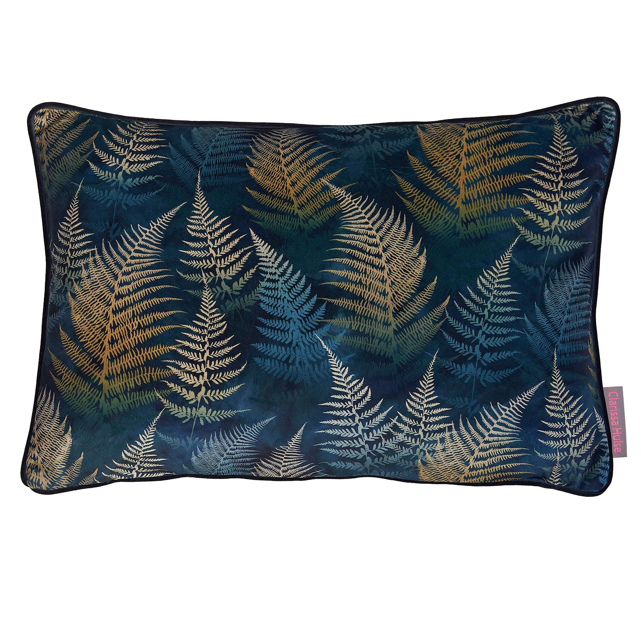 Our Woodland Fern velvet cushion features graceful fronds of ferns, which seem to glow in the forest half-light. This soft velvety fabric will add both depth and luminosity to any room, through its rich inky blue ground, with soft azure highlights.